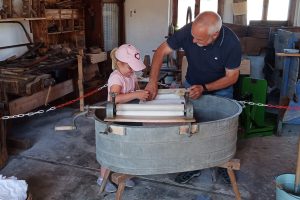 Spinnen und Kartieren von Wolle und an Steffen und Silvia Kühn für die Öffnung der Hofmühle und